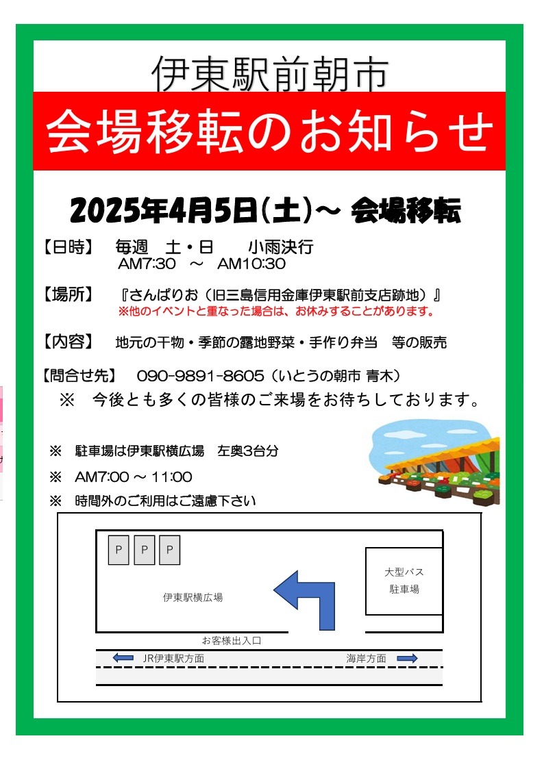 2月23日(日)の朝市は、伊東駅前三島信金跡地広場で開催されるみらいず朝市に出店します。